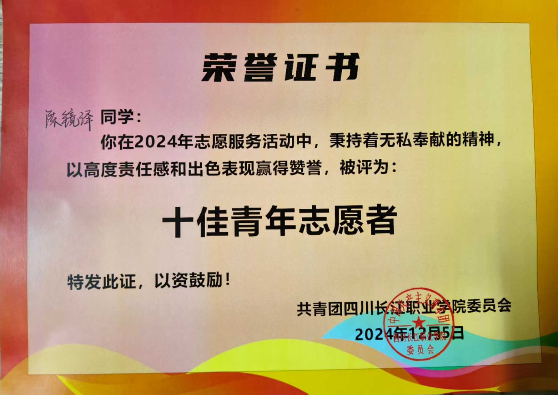 在校期间,陈镜泽先后担任学院党建工作站办公室副主任、班级学习委员和安全员,是老师得力的助手、同学信赖的伙伴。他凭借持续的努力,收获了“十佳青年志愿者”、“优秀干部”、“四川省优秀大学毕业生”等累累硕果,并荣获国家励志奖学金,其全面发展的综合素养得到了充分印证。