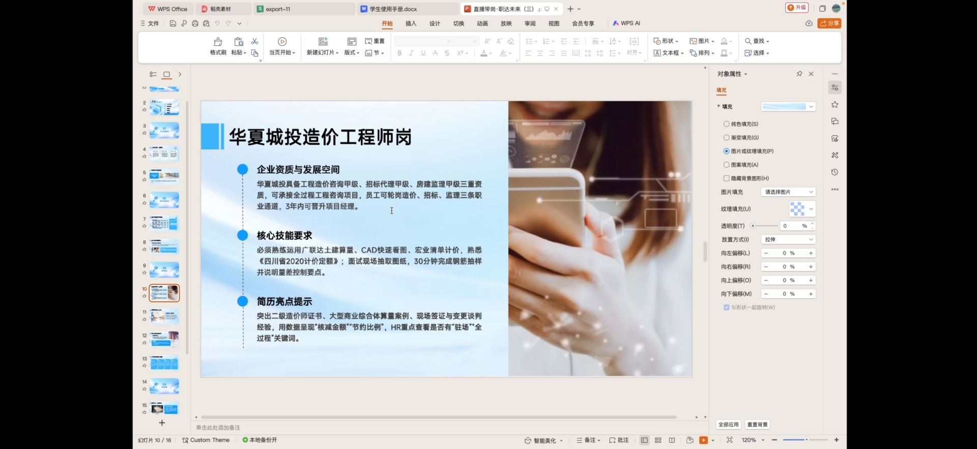 本次直播带岗环节聚焦行业需求,推出了华夏城投项目管理有限公司、四川华慧工程造价咨询有限公司、四川中科川信科技有限公司、重庆江北机场等多家企业的招聘信息,详细介绍了面向建筑专业学生的招聘岗位、职责要求及发展前景,为学生提供了丰富、对口的就业选择。