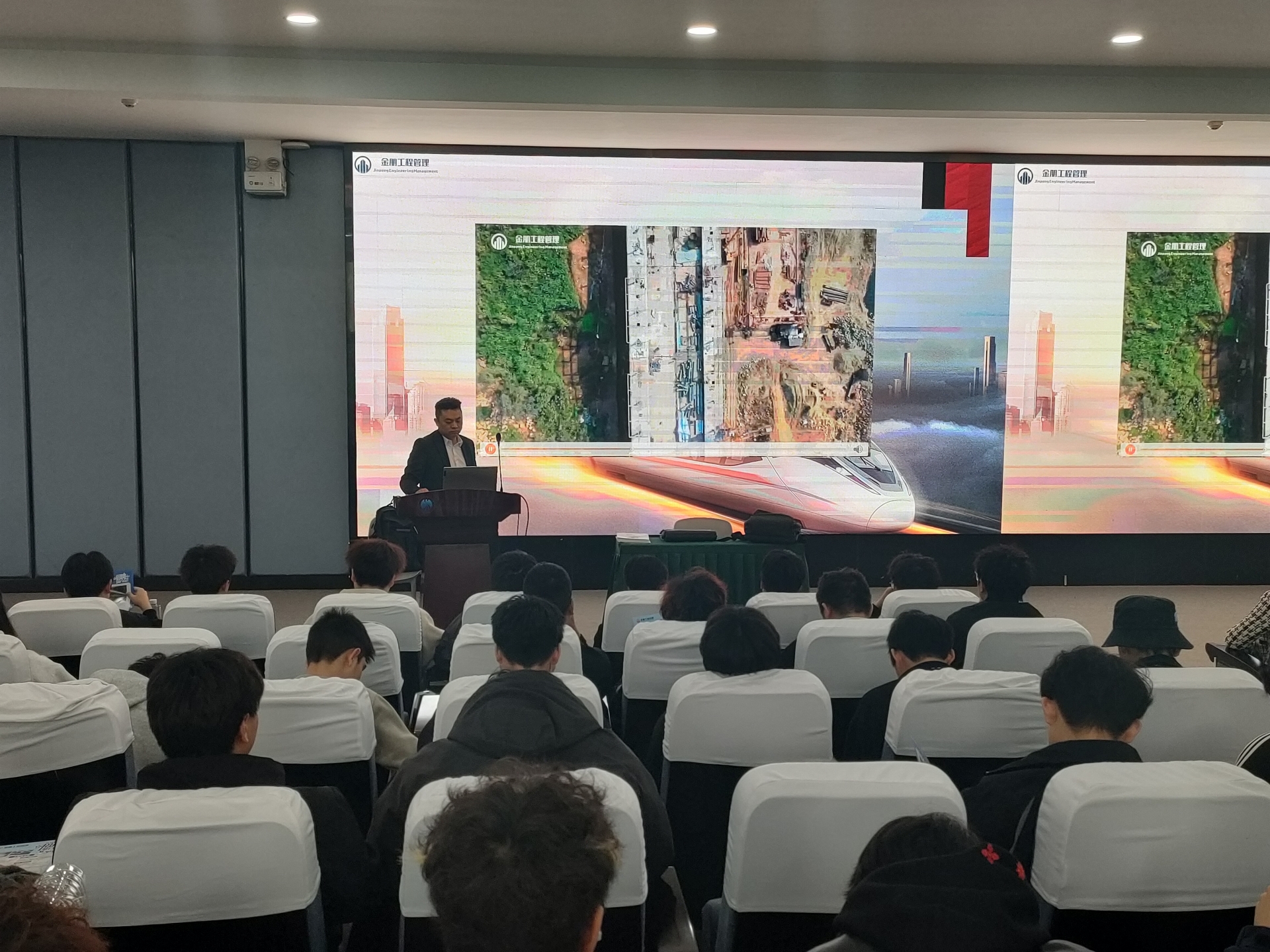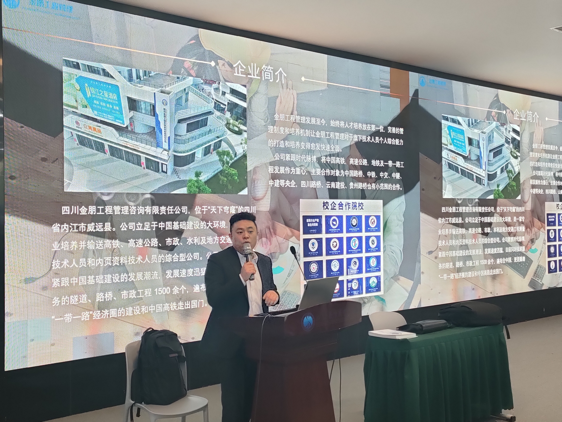 宣讲现场,丁黎明总监详细介绍了企业发展历程、业务范围与人才培养模式。四川金朋专注高铁、高速公路、市政水利等工程领域,长期服务中铁、中交、中建等大型央企,项目遍布全国,技术实力雄厚、发展空间广阔。本次面向学院招聘测量员助手、资料员助手,提供阶梯式成长通道与完善薪酬体系,从基础积累到独立带队,薪资随技能稳步提升,为同学们提供清晰职业发展路径。