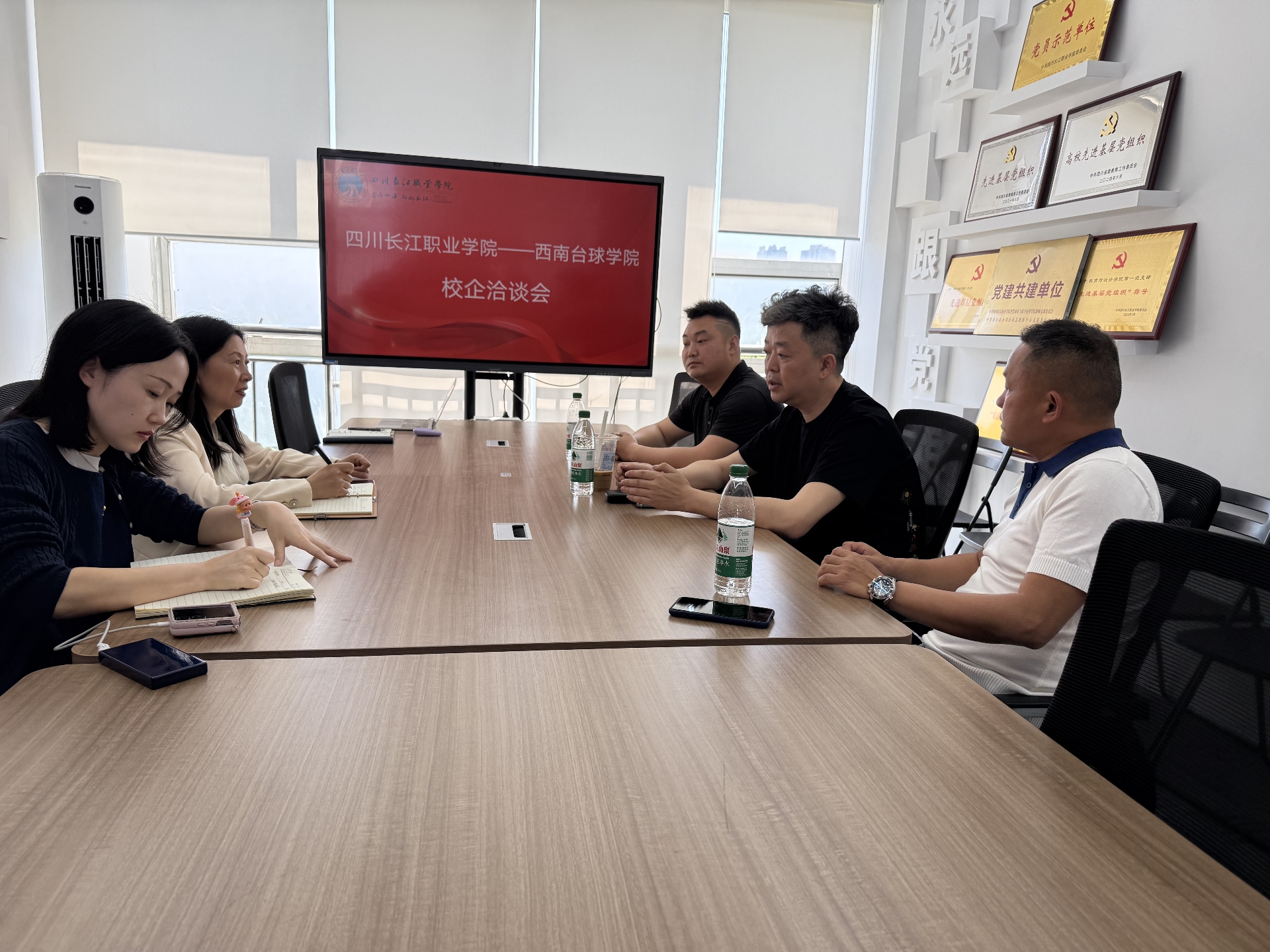 【本网消息】(智慧城市与低空应用学院 王琦月供稿)为进一步深化产教融合,推动体育类专业高质量发展,4月9日,西南台球学院黎老师、匡老师、中国台球协会委员张涛等一行莅临我校交流访问。我校院长龚长兰、主任刘莹及教师王琦月参与座谈。