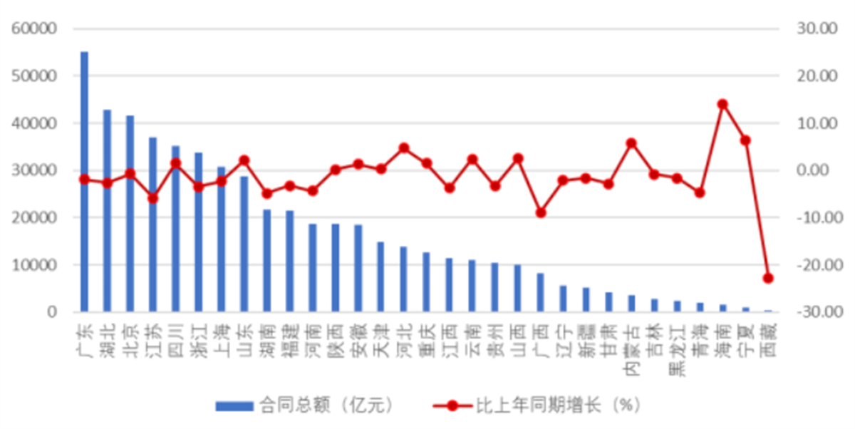 中国建筑业协会发布《2025年上半年建筑业发展统计分析》,2025 年上半年,广东、湖北、北京、江苏、四川、浙江、上海7个地区建筑业企业签订合同总额均超过30000亿元。全国建筑业直接从事生产经营活动的平均人数超过百万的地区有15个。