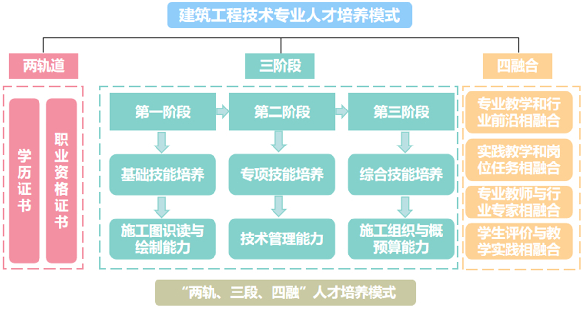 1.“两轨、三段、四融”人才培养模式。