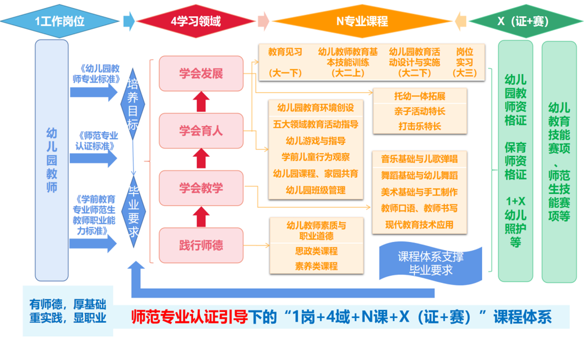 以师范专业认证为引导,以幼儿园教师岗位需求为引领,构建“岗课赛证”紧密融合的“1岗+4域+N课+X(证+赛)”课程体系。